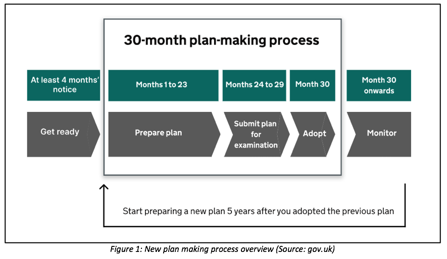 The Government’s new plan-making system is being implemented throughout 2026; LPAs will have until the end of 2026 to submit their local plans under the existing system, before that system is retired. As shown in Figure 1, the new plan-making system includes a 30-month timeframe for preparing a local plan, from commencement to adoption. It also requires LPAs to start preparing the next local plan five years after the adoption of the previous one.