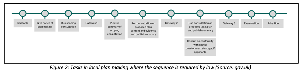These timescales will be monitored through a local plan timetable that each LPA must prepare under the Levelling Up and Regeneration Act 2023, and the LPA “must, at such times as may be prescribed, seek observations or advice in relation to a proposed local plan, from a person appointed by the Secretary of State.” (15CA,(3)). These ‘observations’ are translated into the three gateways referred to in the draft NPPF and in Create of update a local plan using the new system – GOV.UK: Gateway 1 is at the commencement of the plan, Gateway 2 is at the midpoint and Gateway 3, prior to examination (Figure 2).